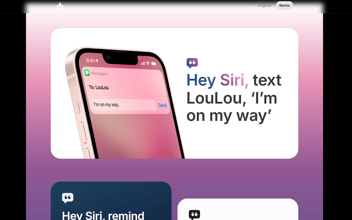 Command-based UI storytelling (“Hey Siri, text LouLou…”, “Hey Siri, remind me…”)