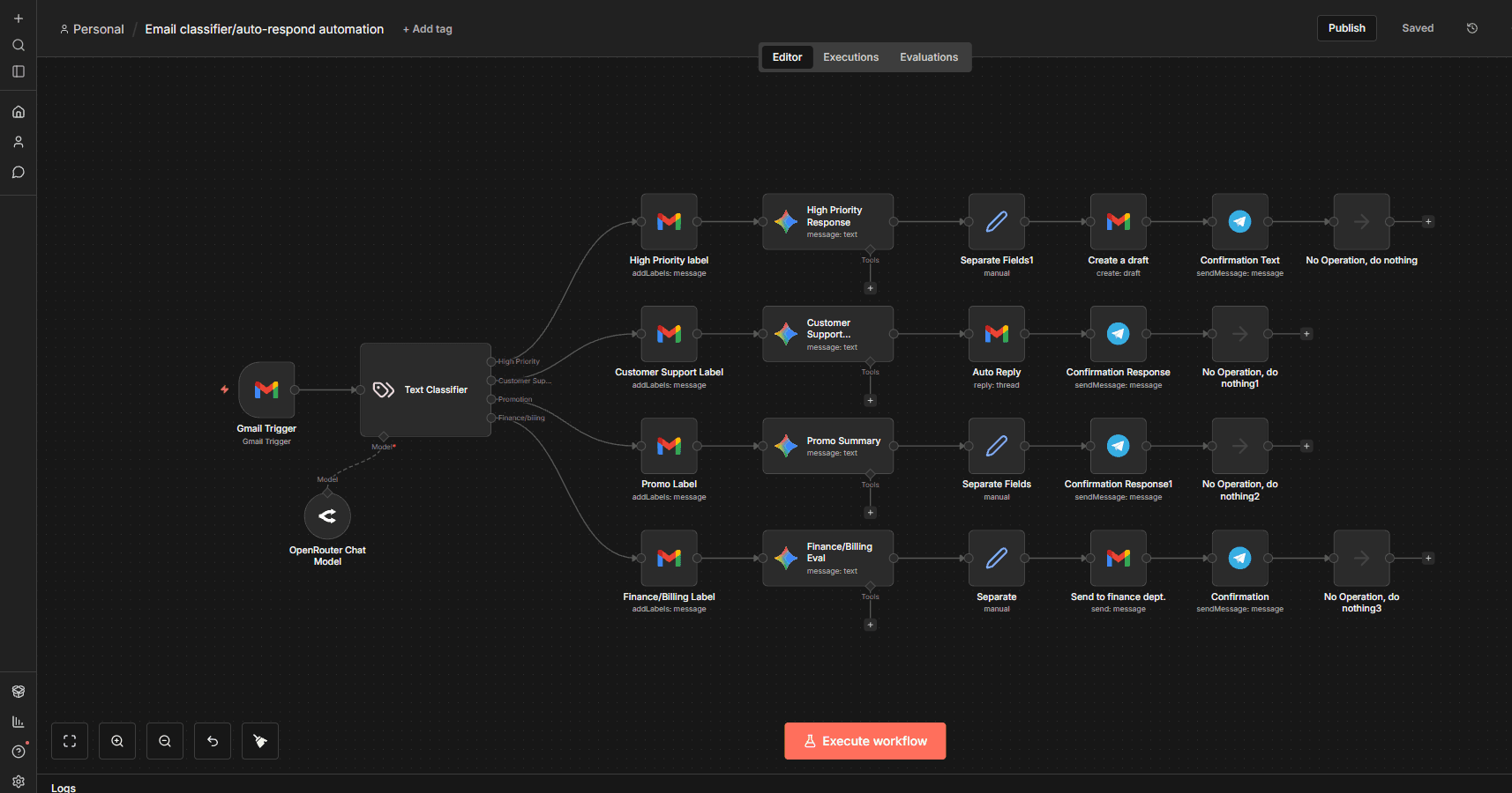 The system doesn't just classify—it takes action. Customer support emails get instant auto-replies, high-priority items alert the team immediately, and complex requests get AI-drafted responses ready for human approval. This reduces response time from hours to minutes.