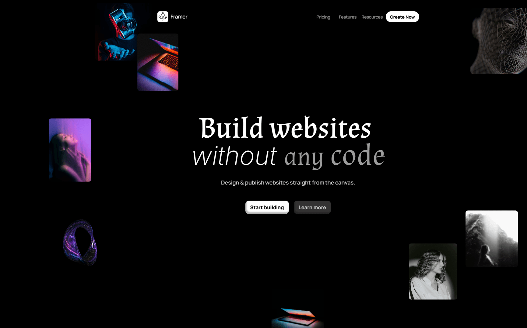 Full-screen cinematic layout with floating gallery visuals and zero visible grid lines