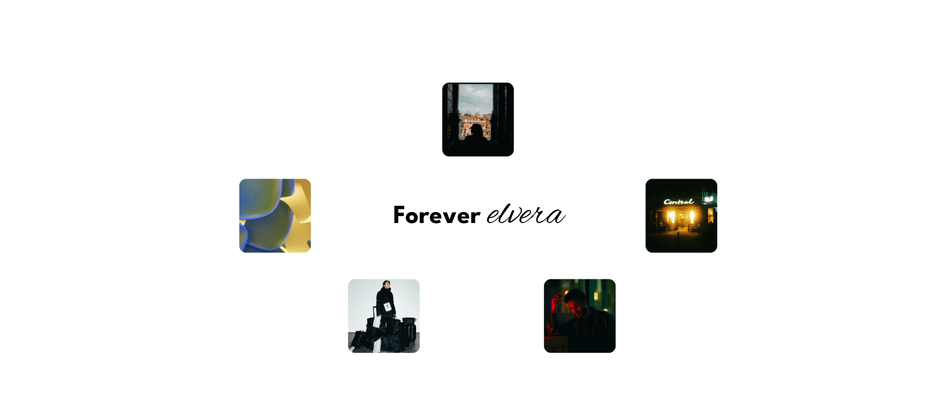 A futuristic interaction website built around a floating circular orbit of visuals, gracefully rotating around the title “Forever elvera.”
