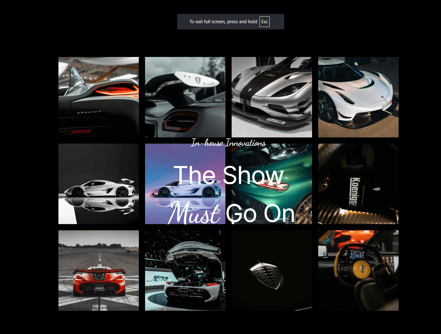 As users navigate, the bold grid of imagery remains center stage, while the line “The Show Must Go On” emerges like a manifesto — perfectly matching the confidence and performance identity of Koenigsegg.